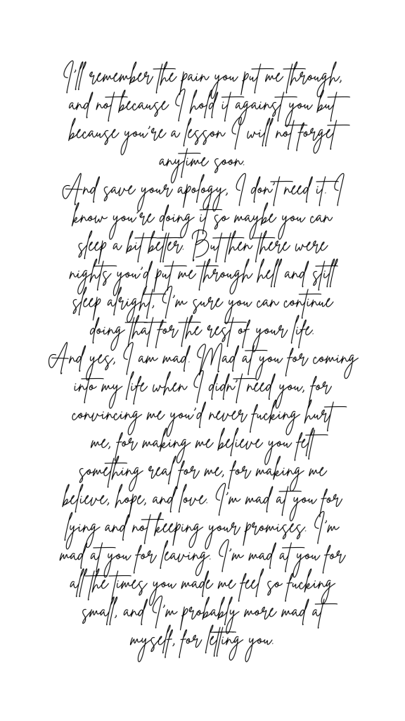 I admit it’s painful to think and know we’ve really parted, after many many tearful goodbyes. And that no matter how much it mattered at the moment, one day it won’t. I can’t blame you for moving on, just because I struggle to and when all I’ve done is push you away.